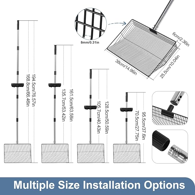 - 【Adjustable Length for All Users】: Comes with a five-section extended handle that allows you to easily customize the total length for different tasks and user heights. With a maximum length of 76.5 inches (25.5 cm + 168.8 cm handle), this scooper adapts to your needs—whether you're cleaning a small coop or a large animal stall.