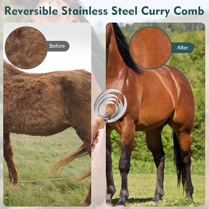 - All-In-One Horse Grooming Accessories Set: GHWMYD horse brush set includes 13 kind of grooming essentials, including Soft Brush, Hard Brush, Rubber Glove Brush, Bathing Sponge, Oval Massage Curry, Mane Comb, Tail Comb, Braiding Comb and Rubber Bands, Curry Comb, Hoof Pick with brush, Sweat Scraper, Reversible Stainless Steel Curry Comb and a Mesh Storage Bag. From mane to hoof, every aspect of your horse's grooming needs is covered