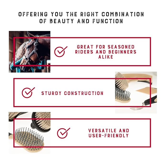- Horse Grooming Kit: Ensure effortless cleaning and grooming of your horses with our horse grooming set; these 6-piece horse essentials include a comb, hoof pick, palm-held brush, mane and tail brush, dandy brush, and sweat scraper/coarse curry combo