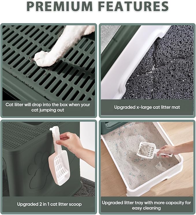 Cat Litter Box with X-Large Litter Mat and Scoop, Large Foldable Litter Box with Lid, Enclosed Kitty Box,Front Top Entry Exit, Odor Control Easy to Clean (Upgrade Olive Green)