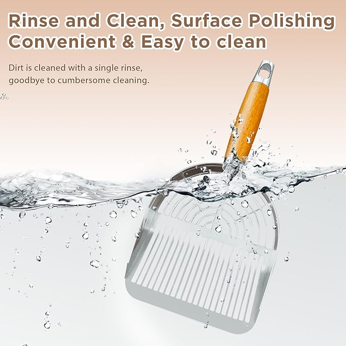 - 5-Second Non-Stick Cleanup – Stainless steel litter scoop’s polished surface prevents litter from clogging, repelling even sticky mud. Rinse without scrubbing and store via holder or hook—no residue after cat poop scooping!
