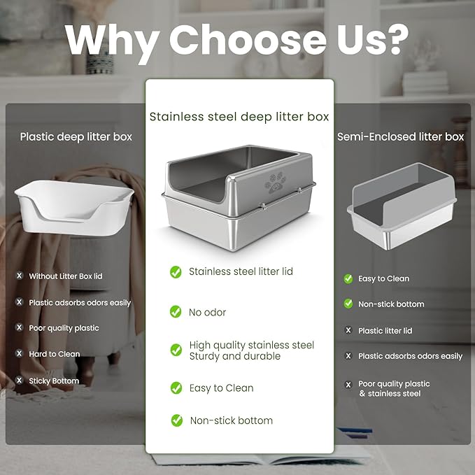 - Doesn't Absorb Odor & Easy to Clean --- The open top stainless steel cat litter box material characteristics will not collect any residue or odor, and the non-stick surface makes cleaning very easy, just a quick rinse and wipe with water to complete the cleaning easily. So if you don't like the characteristics of plastic litter boxes that will retain odor and want an easy way to clean, this stainless steel litter box is a great choice for you!