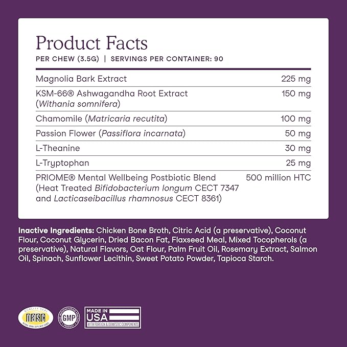 - Premium Traceable Ingredients That Go Beyond the Basics: Our dog calming chews are made with KSM-66 ashwagandha, magnolia bark, chamomile, passionflower, L-theanine, and L-tryptophan; no artificial preservatives, fillers, or dyes