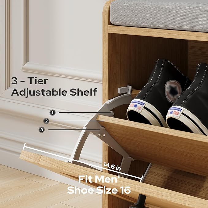 - Flip Drawers Shoe Bench: Overall Dimension of the hidden shoe storage: 43.3" W x 11.7" D x 20.9" H. Featuring with 2 flip drawers, the shoe rack bench adopts a space-saving flip drawer design, which is easy to open and close. The entry way bench helps maintain a clutter-free space while adding a touch of style to your entryway.