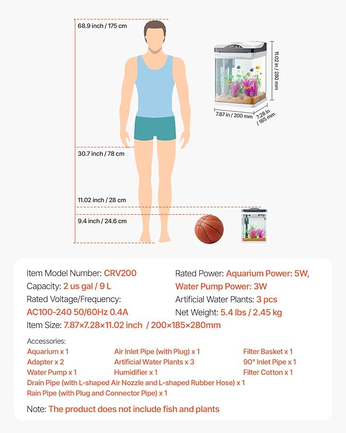 - Included Components : 90° Inlet Pipe x 1, Adapter x 2, Aquarium x 1, Filter Basket x 1, Water Pump x 1