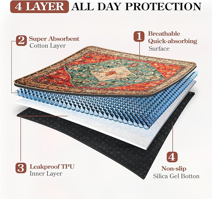 - Ultra Absorbent and Leakproof: Featured a soft, fast-absorbing top layer and a high-density core that locks in moisture on contact. The waterproof TPU backing provides superior leak protection, keeping your floors and furniture clean and dry