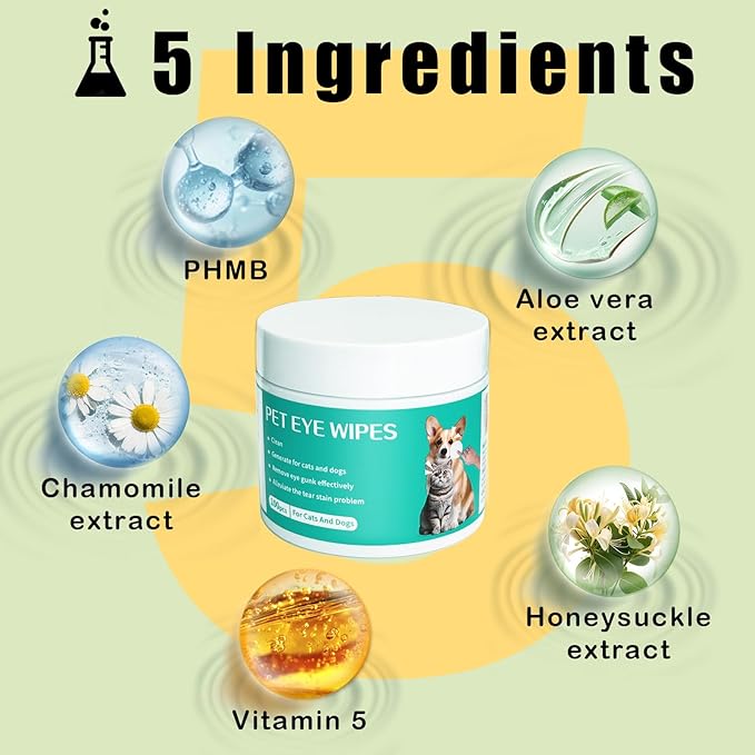 - Hypoallergenic & Naturally Soothing - Our pet eye wipes are infused with aloe vera, chamomile, and honeysuckle extracts to effectively combat eye irritation, remove tear stains and crusts, while neutralizing odors. Free from alcohol, dyes, and harsh chemicals, these gentle wipes are safe for all dogs' delicate eye and facial areas.