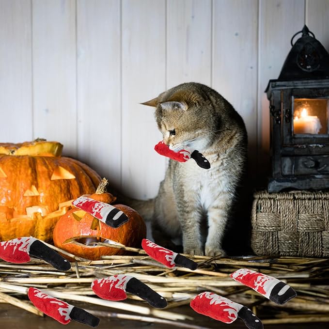 8pcs Catnip Toy, Indoor Knife Shaped Cat Toy Horror Plush Interactive Chew Bite Toys for Halloween Christmas Cat Kitten Indoor Festive Holiday Cat Lover Gift