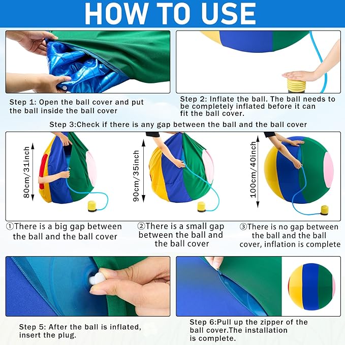 - Please Refer to Third Picture for the Inflation Installation: first, put the horse ball into the ball cover, open the air plug, and start to inflate; When inflated to 31 inches, there is a large gap between the horse ball and the ball cover; When inflated to 35 inches, there is still some gap between the horse ball and the ball cover; When inflated to 40 inches, the horse ball and the ball cover fit completely, inflation is complete, plug in the air plug, and finally zip up