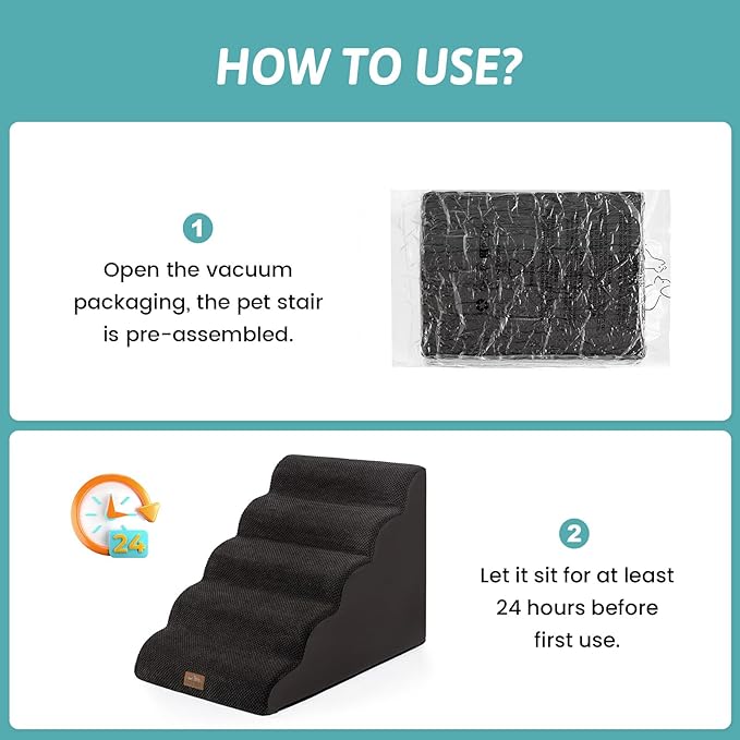 - EXTRA WIDE PET STAIRS: This wide dog ladder is designed to lean against the edge of a bed, car or other furniture. This is a portable dog ladder suitable for small, medium or large dogs. Please note that due to vacuum compression, it takes 24-48 hours for the sponge to rebound. There are wrinkles when opening the packaging, which is the result of long-term compression. You can iron it to keep it flat