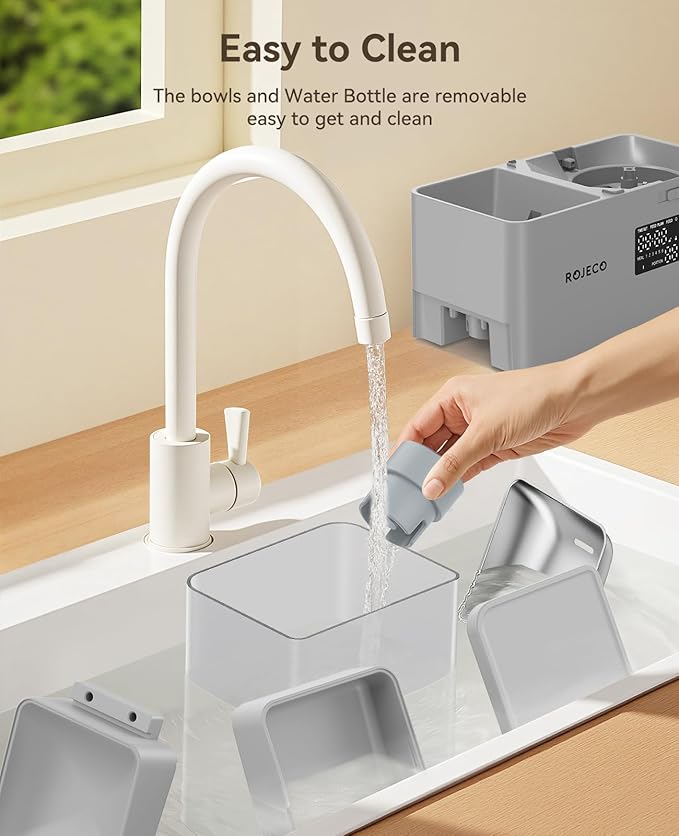 - 【2 in1 Feeder,Scientific Feeding】 2-in-1 Automatic Cat Dog feeder and Water Dispenser, separate feeding water feeder prevents wet food and prevents pets from eating moldy or wet food; 5L food + 3.5L water supports extended travel (2 cats up to 7 days), reducing the possibility of pets going hungry during travel/overtime.
