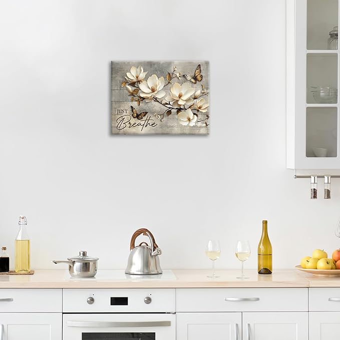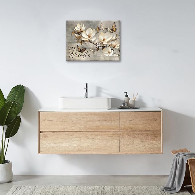 Floral Magnolia Bathroom Pictures Wall Art, Just Breathe Bathroom Wall Decor, Flower Butterfly Framed Painting Canvas Artwork for Bedroom Living Room Decorations 20"L x 16"W