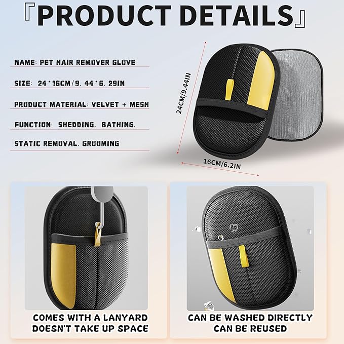 - 【Multi Application】This static hair removal glove is suitable for various surfaces, including sofas, beds, carpets, clothing and car seats. Suitable for long-haired and short-haired breeds and various other hair pets, and can also be used as a daily tool for pets. It can be hand washed and machine washed, and the dirt can be washed away with one rinse.