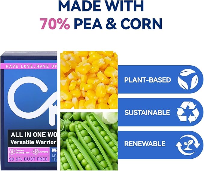 - 【100% Natural & Eco-Friendly Composition】OPET Cat Litter crafted from 70% plant-based materials—including pea fiber and corn starch—and 18% sodium bentonite. Thanks to its natural and non-irritating properties, this plant-based natural litter ensurs the health of your cats and especially for your little kittens.