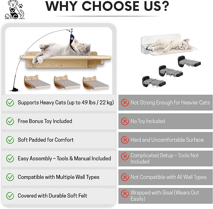 - Transform your wall into an adventure zone with our cat wall shelf system, including 3 climbing steps and 1 wide lounging shelf. Whether your cat loves to jump, perch, or nap, this vertical setup keeps them engaged and happy all day long.