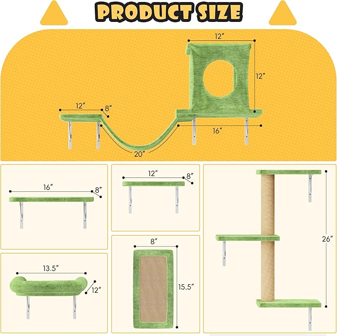 NUNU LAB Wall Mounted Cat Furniture, 6 Pcs Cat Wall Shelves with Condo House, Bridge, Steps, Scratcher, Hammock, Indoor Safe & Stable Furniture for Kittens Play, Green