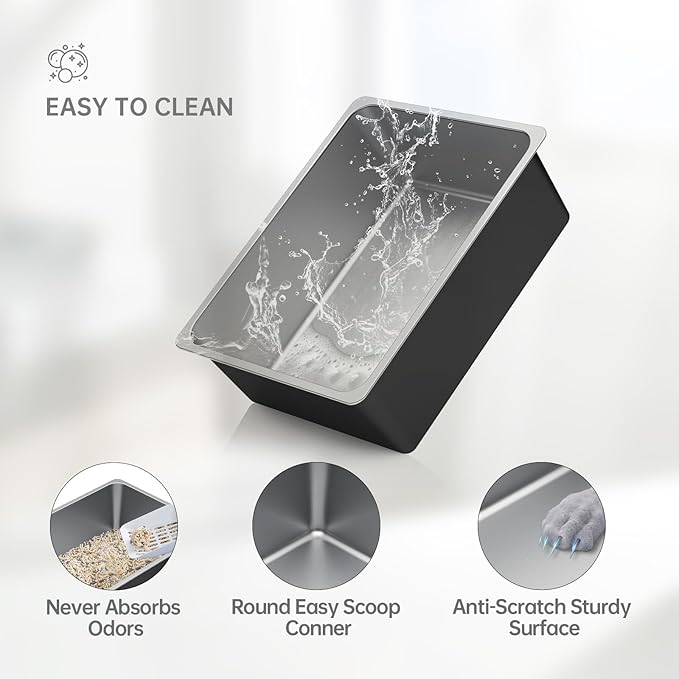 - Perfect Size, Reduce Smell: Our cat litter box, measuring 23.43"L x 15.6"W x 6"H, features a large interior that allows large or small cats to complete their private activities. Compared to plastic litter box, our litter box is made from stainless steel, which does not absorb sticky smells, stains, or rust. Its construction resists scratches from cat claws or litter scoops and minimizes dents. Our litterbox can accommodate various types of litter, including pine, crystal, pellets, and clumping.