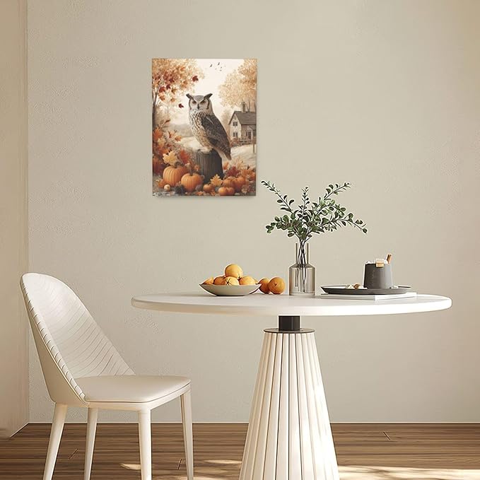 Fall Owl Wall Art Autumn Pumpkin Leaves Wall Decor Rustic Canvas Print Farmhouse Pictures Painting Print Framed Artwork Decorations Gifts for Living Room Bathroom Bedroom Office 12"x16"