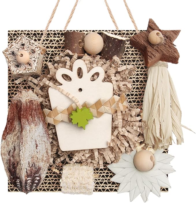 - 🌿 Natural & Safe Materials Carefully selected natural materials beloved by parrots - featuring an eco-friendly cardboard base combined with chewable dried starfruit, palm fiber stars, apple wood blocks, corn cob strands, soft silky grass bundles, and natural wooden beads. Completely safe and healthy, allowing your feathered bird friends to fully enjoy exploring and chewing!