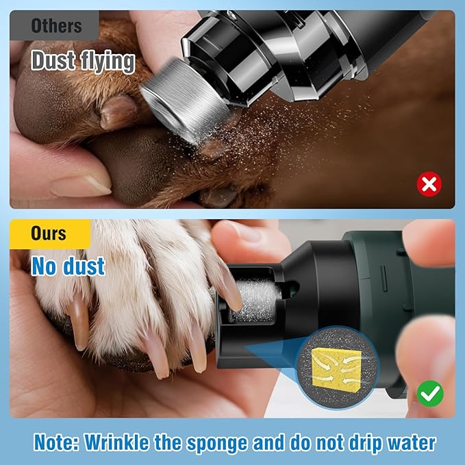 - Dust Sponge Design: No more worrying about nail dust flying everywhere when trimming your dog's nails. Our dust sponge absorbs most grinding dust, keeping floors clean while effectively preventing dust inhalation by both people and pets