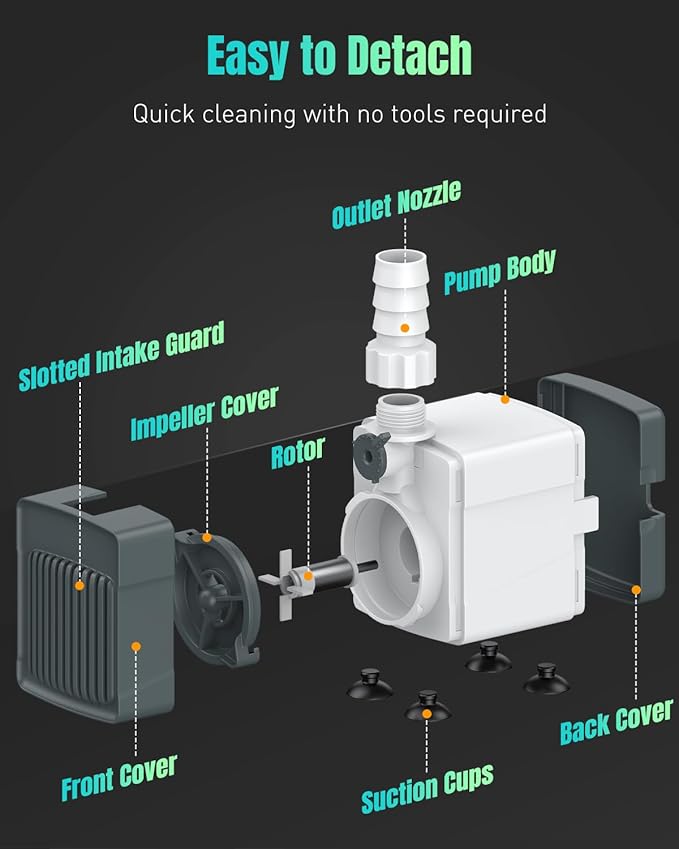 - Smart & Convenient Design: The protective intake cover keeps out shrimp, fry, and debris without restricting water flow. Also, all parts can be easily detached and cleaned without any tools. Highly convenient for smooth maintenance