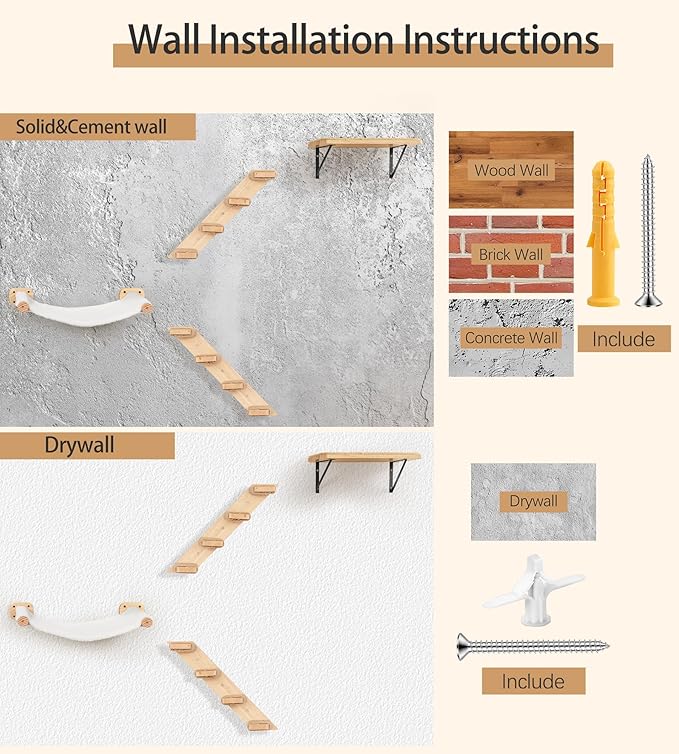 - Easy Installation, Fits Any Wall: Quick Setup on Drywall, Concrete, or Brick. Includes all tools, mounting hardware, pre-drilled holes, and step-by-step instructions; Whether you live in an apartment or house, this wall mounted cat furniture is easy to install and saves floor space.
