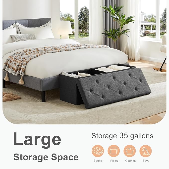 - 【Durable & Cozy】: This storage ottoman bench is constructed with solid MDF boards, delivering exceptional sturdiness. The seat is padded with high-resilience foam and wrapped in a chic charcoal linen fabric, balancing comfort with breathability. The ottoman bench boasts a static weight capacity of up to 350 pounds.