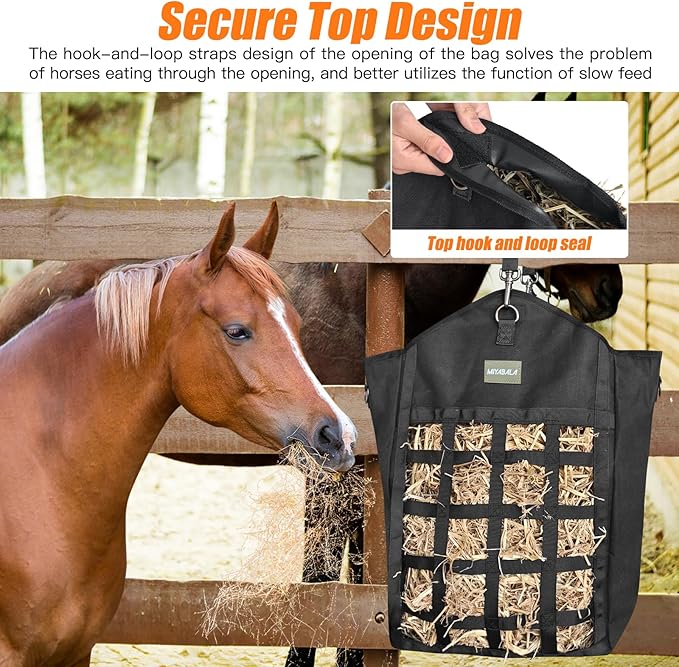 - Secure and Easy-Fill Top:The spacious opening makes filling and hay management simple.It is equipped with secure hook-and-loop straps to prevent horses from pulling hay through the top.This crucial design ensures the horse feed bag functions optimally for slow feeding, promoting safer and healthier eating habits for your animals