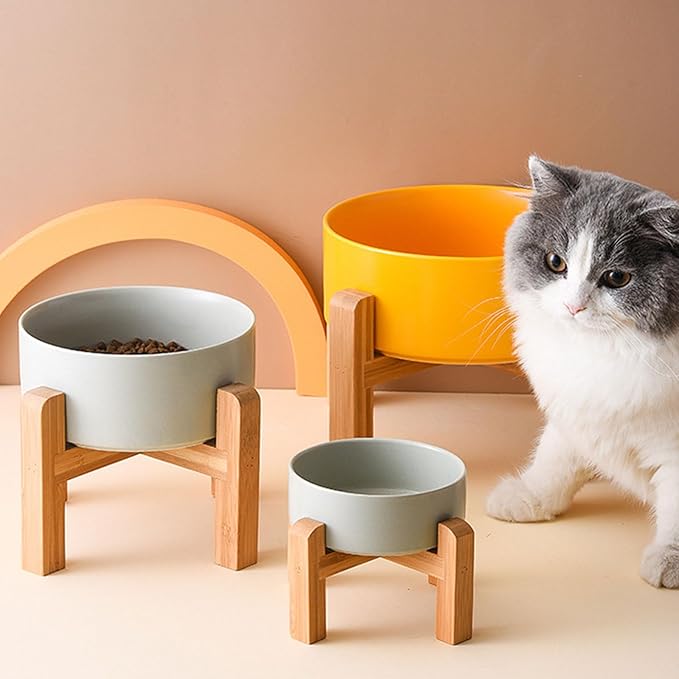 - NON SLIP WOOD STAND -You can get two different heights by flipping the bamboo stand,the elevated medium size ceramic pet bowls are perfect for small and medium dogs from different stages of childhood to adulthood, The wood stand on the bowls stopping ceramic dog bowl from sliding around, Keeps pet food and water in the bowls.