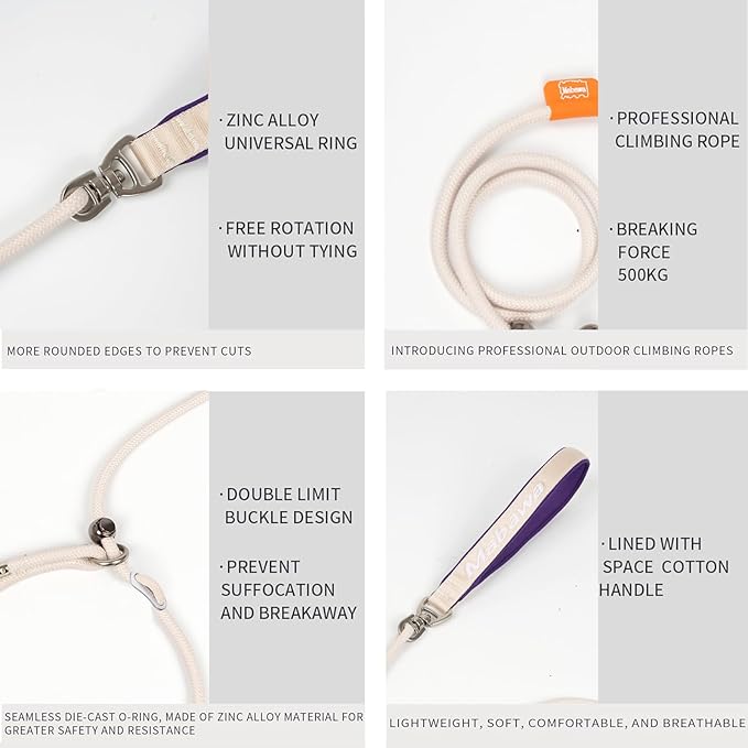 - 【Double Limit Design】: Heavy duty rope dog leash has 2 metal stoppers, which are anti-suffocation and anti-escape, and can easily stop the dog from pulling and will not cause harm to the dog. No-pull training, correcting bad behavior and controlling it in a short period of time, this chew proof leashes for dogs is effective for most dogs.