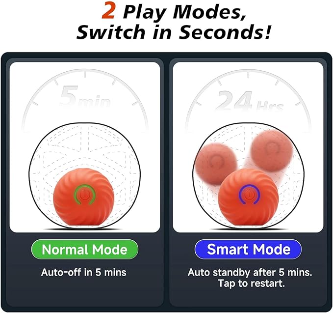 - 【2 Selectable Modes】:Switch between Normal Mode (Green Light) and Smart 24-Hour Mode (Blue Light) with a long press. In Normal Mode, the ball moves for 5 minutes and stops automatically. In Smart Mode, it sleeps after 5 minutes but reactivates when touched by your dog—perfect for interactive all-day play.