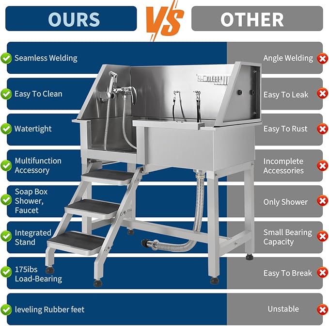 - Professional Stainless Steel Dog Washing Station — Durable & Leak-Proof:Built with premium stainless steel and seamless welding technology, our dog washing station ensures a leak-proof, scratch-resistant experience for all dogs. With a 220 lbs load capacity, this dog grooming tub is perfect for small, medium, and large dogs, suitable for both home and professional pet grooming use. Say goodbye to messy clean-ups with our pet bath solution.