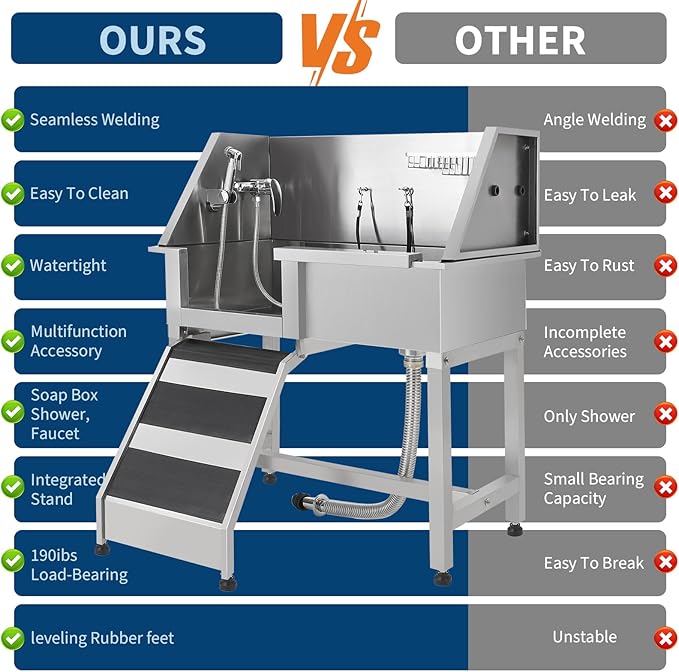 - Professional Stainless Steel Dog Washing Station — Durable & Leak-Proof:Built with premium stainless steel and seamless welding technology, our dog washing station ensures a leak-proof, scratch-resistant experience for all dogs. With a 220 lbs load capacity, this dog grooming tub is perfect for small, medium, and large dogs, suitable for both home and professional pet grooming use. Say goodbye to messy clean-ups with our pet bath solution.