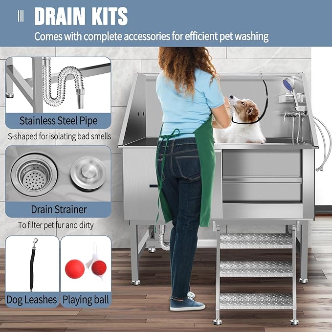 • 3. Smart & Convenient Features: Multi-functional faucet with hot/cold water and showerhead with comb teeth.S-shaped stainless steel drain pipe for fast, clog-free drainage. Shower rack for organized storage—everything you need for a full grooming session at home!
