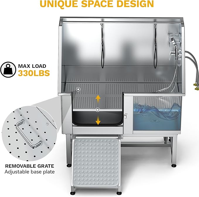 - Durable 304 Stainless Steel Tub Body: With a 330 lb weight capacity, this pet bathtub is built for long-lasting use; The fully welded, one-piece design prevents leaks, while the smooth surface allows for easy cleaning and maintenance