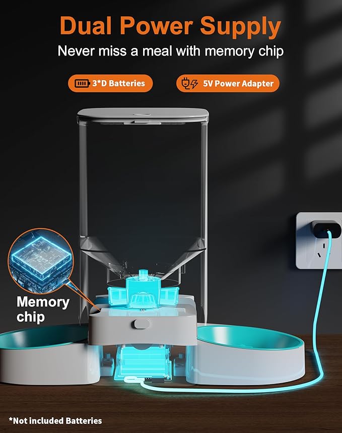 - 【Dual Power Supply】The feeder comes with a Type C adapter and has the option to use 3 D-cell batteries (not included), We recommend using both battery and adapter. The machine needs to be plugged in when used with wifi connection.In the event of a power outage, the automatic dog feeder will continue to run on 3 D-size batteries to ensure your pets never miss a meal.