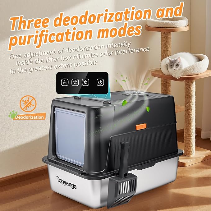 - Electric Odor-Control System: Our deodorizing stainless steel cat litter box is equipped with a plasma generator, which is far different from other fake odor-control litter boxes on the market. Our stainless steel litter box with lid is equipped with an adjustable triple-speed fan to accelerate plasma diffusion and effectively deodorize up to 85%, truly achieving the function of deodorization.